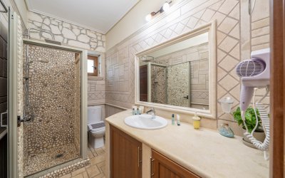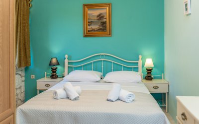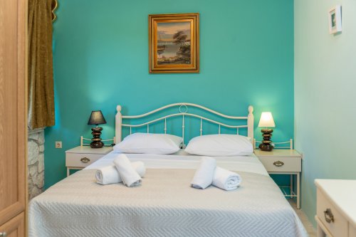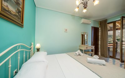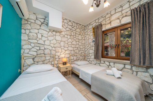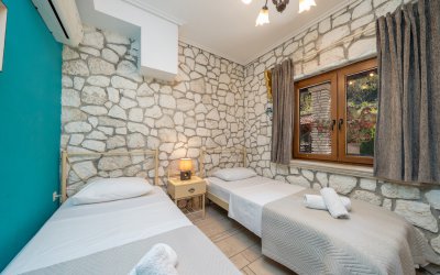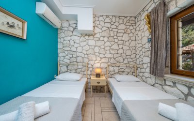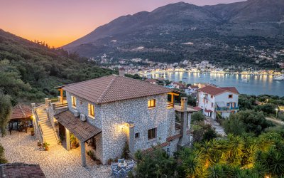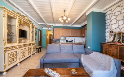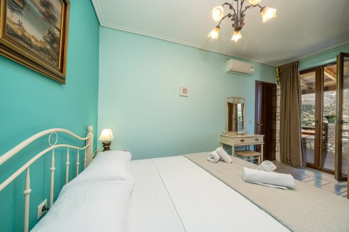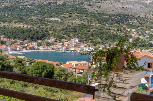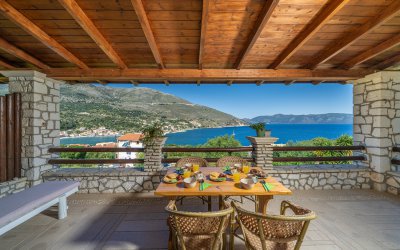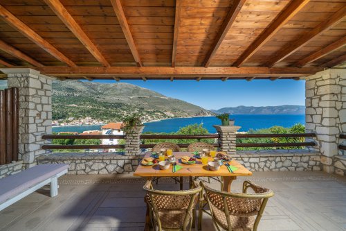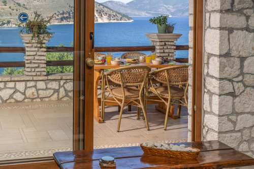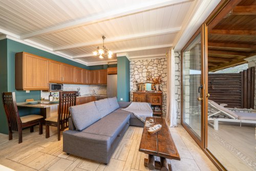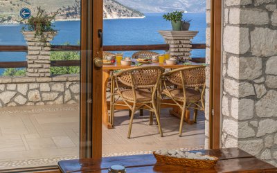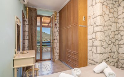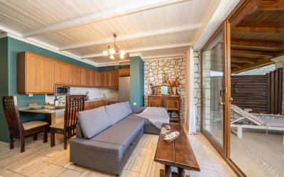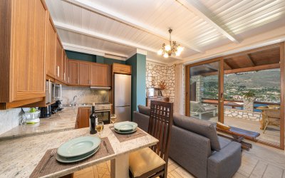 Located on the first floor, this bright and spacious apartment is ideal for families or two couples looking to enjoy Kefalonia in comfort and style. It features two separate bedrooms — one with a double bed and one with two single beds — along with a shared bathroom and an open-plan living, dining, and kitchen area. Natural stone walls and wooden details offer a rustic yet elegant feel, while the layout is designed for easy, relaxed living. The highlight of this apartment is the large front-facing balcony, accessible both from the living area and the master bedroom. It offers sweeping views of the sea, the bay, and the charming village of Agia Efimia — the perfect setting for morning coffee or an evening drink. With plenty of natural light and panoramic views from the living space, this apartment blends space, serenity, and homely charm